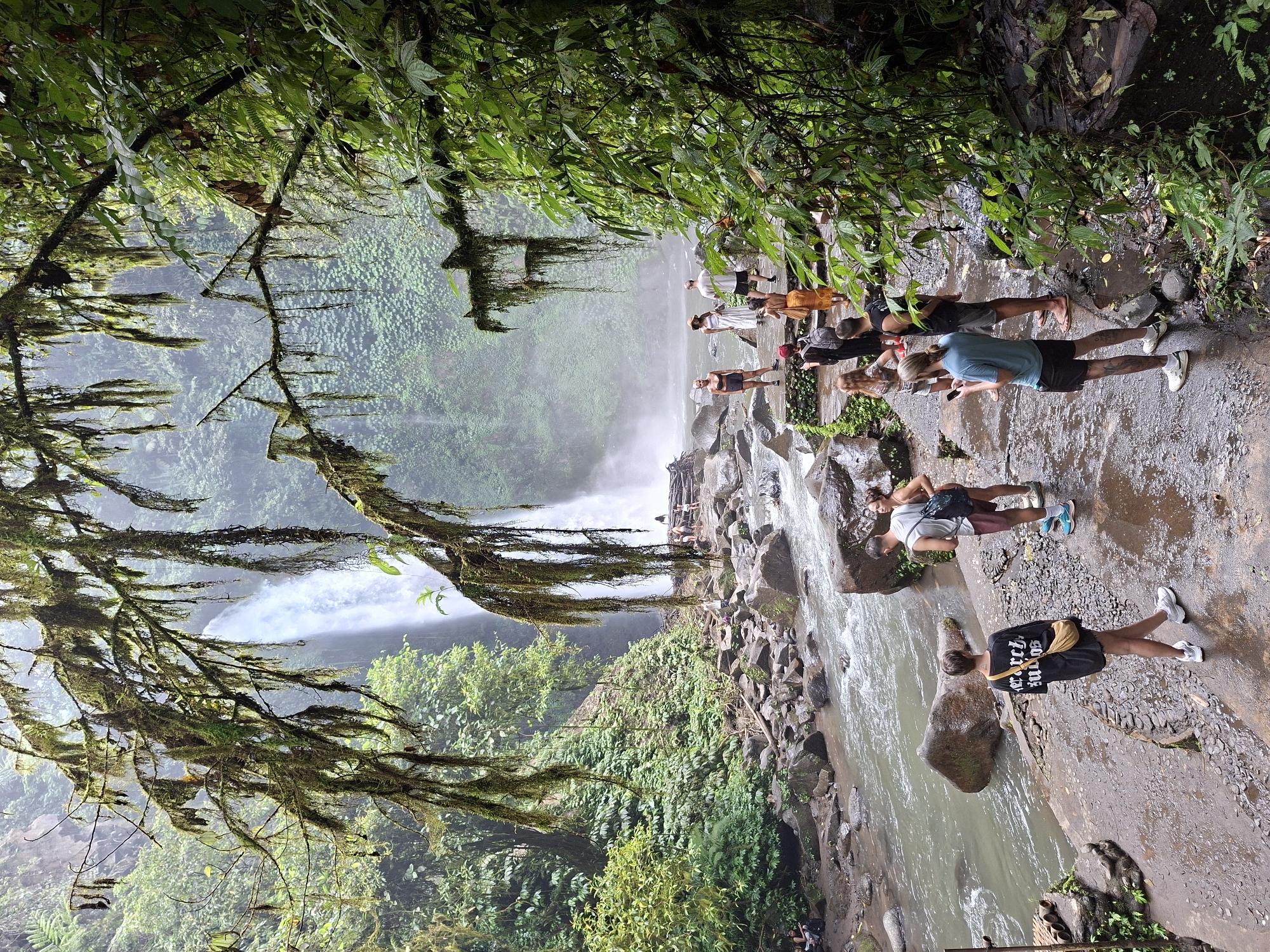 tourist location, presumably in Petang, Indonesia, as suggested in the request. The scene includes a waterfall with lush green vegetation covering the surrounding landscape. A group of people are present near the waterfall, some appearing to be taking pictures or enjoying the view. A stream flows from the waterfall, with rocks and plants alongside it. Some tree branches covered with moss overhang the scene.