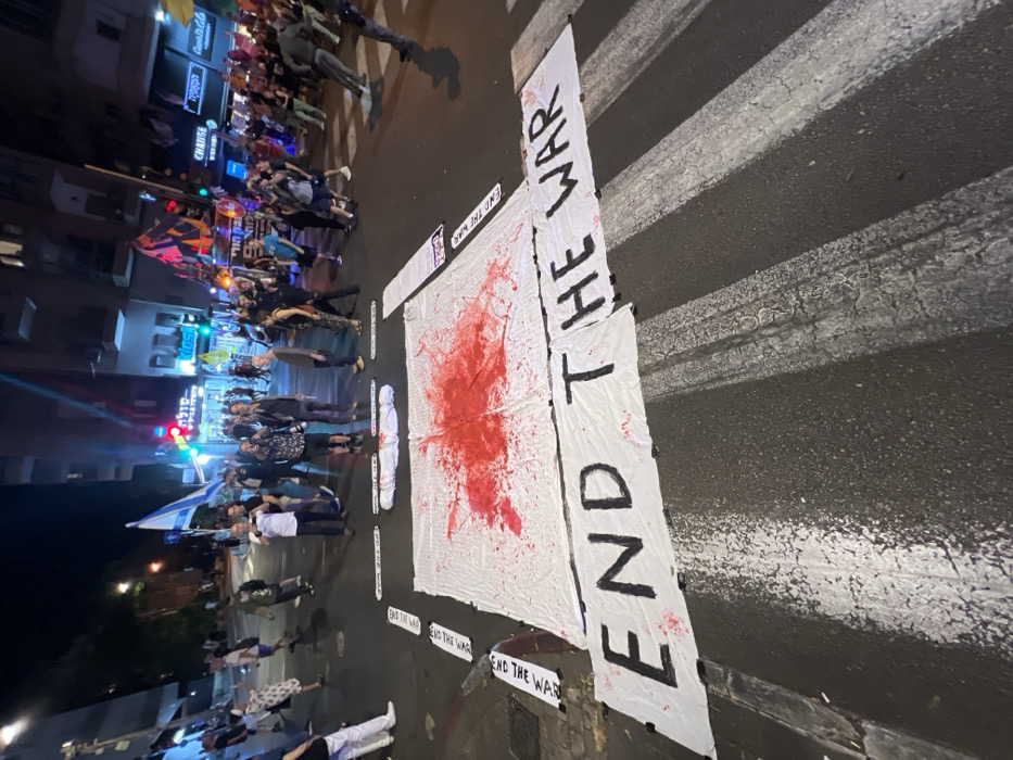 The image depicts a nighttime anti-war demonstration on an urban street in Tel Aviv, Israel