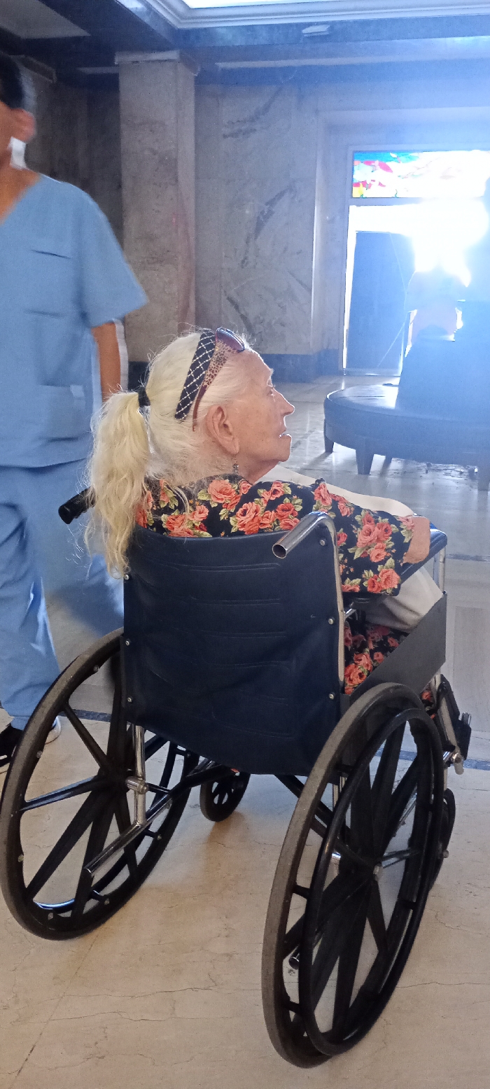 An elderly woman with white hair pulled back in a ponytail and adorned with a patterned headband sits in a wheelchair. She wears a floral top. A person in blue scrubs stands to her left, partially out of frame. The scene takes place in a marble-floored building with marble pillars. A door with brightly colored glass is visible in the background, along with additional seating.