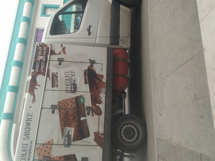 - "A white commercial delivery truck, featuring "CHOCOLATE SANDWICH" branding and "IMKON PLUS" logos, is parked on an asphalt road adjacent to a concrete sidewalk" by FM-2nDsH3, licensed under CC BY 4.0