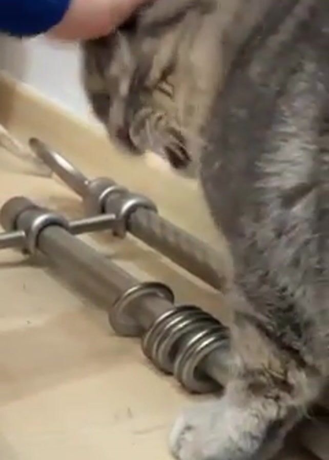 A person with a blue sleeve pets a grey cat. The cat, with its paw on a pair of metal rods, meows and hisses as it's being pet. A different person then pets the cat with a fingernail painted blue. The cat looks to the left of the screen. The cat is on a wood-colored floor next to a white wall.