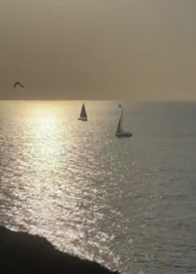 seascape at what appears to be dusk or dawn, with the sun low on the horizon, creating a bright reflection on the water. Two sailboats are visible in the distance, each with its sails up, suggesting they are underway. A third, smaller sail may be visible further to the right and away from the other two. The foreground shows a dark, silhouetted hillside or cliff. The overall scene is serene and somewhat monochromatic due to the lighting conditions. The water is choppy, with visible wavelets.