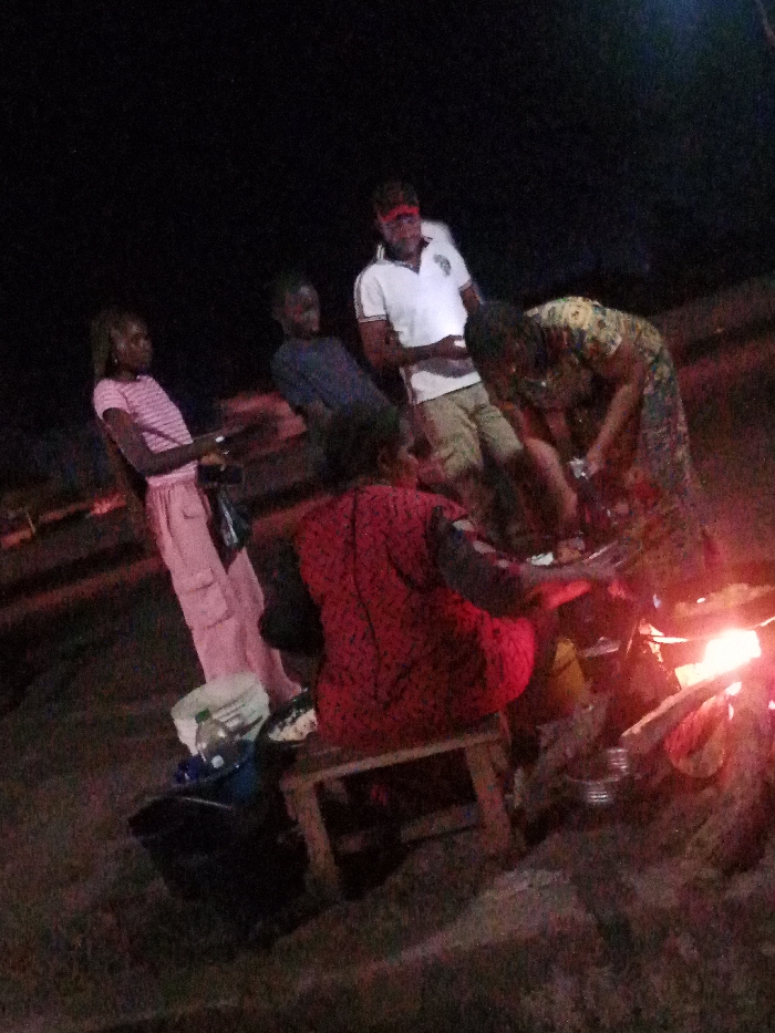 A group of people are gathered around a bonfire at night. There is a woman sitting on a wooden stool near the fire. Another woman is tending to something on a table next to the fire. A man with a red headband stands behind the table, along with two other people standing behind him. There is a bucket and some containers on the ground near the stool. The scene is illuminated by the fire and some overhead lighting.