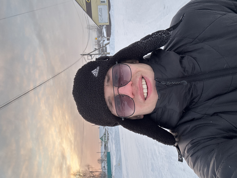 - "The image displays a male individual in a selfie, smiling directly at the camera, set against a winter landscape in Ольховка, Russia" by FM-ZWbe03, licensed under CC BY 4.0