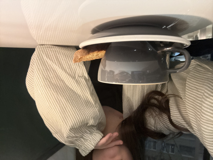 A person lies down wearing a striped shirt. The face is partially obscured by a hand. Balancing on top of the person are several white plates stacked on top of a gray coffee mug. A piece of biscotti sticks out between one of the plates and the mug. Outside the window are other buildings.