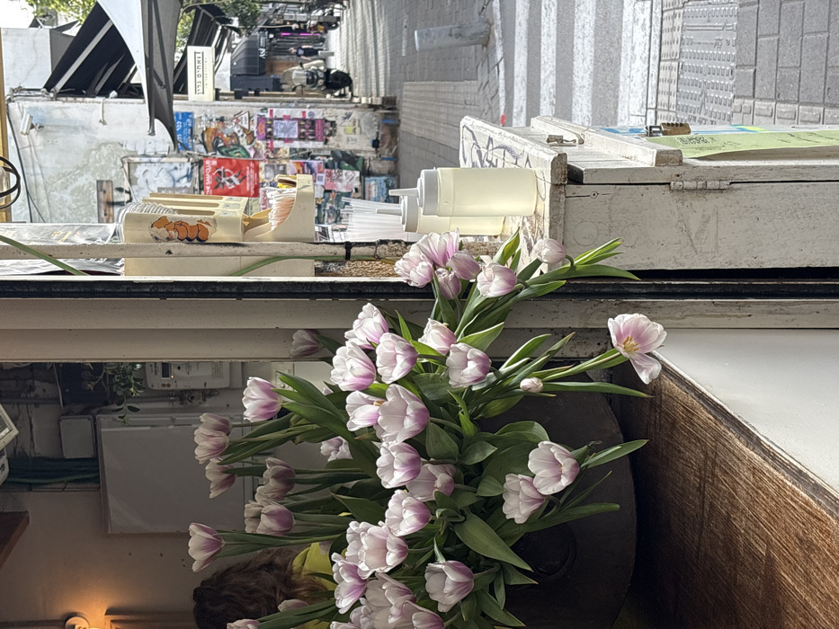 A vase of pink and white tulips sits on a reflective surface, doubling the floral display. Behind the flowers, a white-painted service counter holds containers, napkins, and squeeze bottles. Further back, the streetscape reveals layered posters, urban fixtures, and glimpses of a bustling scene, all viewed through an open storefront.