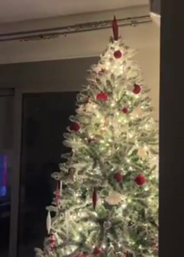 A Christmas tree decorated with lights and red ornaments is shown. The tree is flocked with white material meant to simulate snow. The room it is in gets dark as the camera's lens changes to adjust to the changing light. A sliding door to the left is partially visible. A voice can be heard speaking.