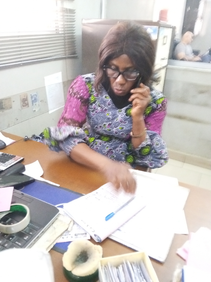 The image depicts an indoor office environment within the city of Dakata, Nigeria. A middle-aged woman with dark hair and glasses is seated at a light-brown wooden desk. She is wearing a patterned dress with purple, blue, and green designs. Her right hand holds a dark-colored mobile phone to her right ear, indicating she is engaged in a conversation. Her left hand, blurred due to motion, is positioned over documents on the desk. A gold-colored bracelet is visible on her left wrist. The desk surface is occupied by a black calculator, an open laptop with a roll of green tape on its keyboard, a blue pen resting on an open notebook, various loose papers, and a pink sticky note. A mortar with a dark green base and light-colored interior is also visible, alongside a rectangular container holding multiple small white envelopes or slips. In the background, a light-colored metal filing cabinet is present. A window with horizontal blinds is visible to the upper left. Behind the woman, a transparent partition features items taped to a wall, including what appear to be currency notes and other papers. To the far right in the background, a partially visible male individual with light skin and a light t-shirt is seated, facing away from the primary subject.