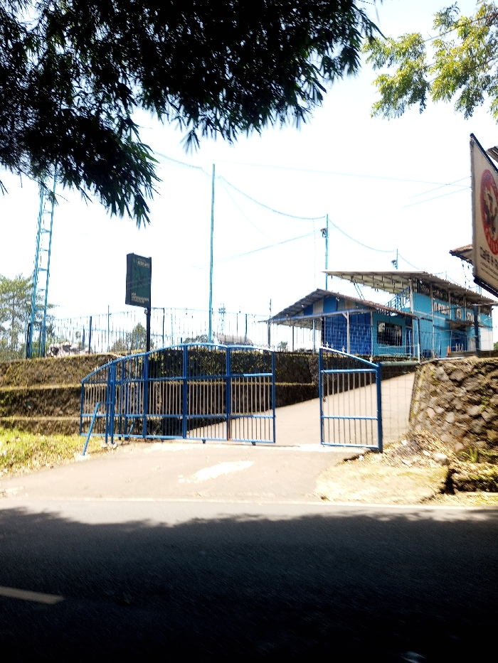 The scene depicts an outdoor recreational or sports facility entrance in Tagtse Tashidingkha, Bhutan, under clear daytime conditions. In the foreground, a dark asphalt road surface occupies the bottom portion of the frame, overlaid with significant, dark shadows cast by an unseen tree canopy directly above. The midground features an open, dark blue painted metal double-gate, leading to an elevated paved access road or driveway. The right gate panel is fully open, swung outwards. To the left of the driveway, a multi-tiered earthen embankment covered with sparse green grass and some exposed soil rises. A blue metal fence runs along the top of this embankment. To the right of the driveway, a dry-stacked stone retaining wall supports the elevated ground. In the background, positioned behind the gate and elevated above the main road, several structures are visible. To the left, a tall, rectangular dark signpost stands next to a light blue metal lattice structure resembling a ladder or support tower. Further back, a system of poles and nets (possibly for a golf driving range or similar sports facility) extends across the background. To the right, a light blue building complex is present, consisting of multiple interconnected units with sloped roofs, some appearing to be corrugated metal. A red and white circular sign, partially visible on the rightmost building section, features a dark animal silhouette (possibly a yak or bull) and text, including "Cafe & Bar." The sky above is clear and bright. No individuals or vehicles are present in the visible area.