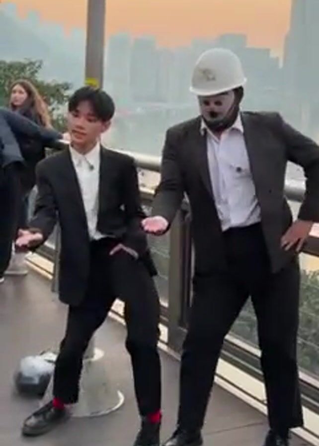Two young men dance together outdoors in front of a skyline view. The man on the left wears a suit with red socks. The man on the right wears a suit, a white hard hat, and a half face mask. Both men are performing the same dance moves. A group of people can be seen in the background.