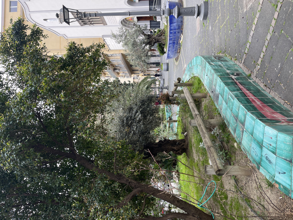 The image captures a public square identified as Piazza Alfano I in Salerno, Italy, with a primary focus on the Chiesa dell'Addolorata and surrounding urban landscape. In the immediate foreground on the left, a large tree with dense green foliage partially obscures the background. Adjacent to this, a low, curved wooden fence constructed from horizontal logs supported by vertical posts defines the edge of a grassy planting bed. Running parallel to the fence, and extending towards the mid-ground, is a prominent, curved public bench or planter wall. This structure is clad in glazed turquoise-green square tiles, featuring a distinct horizontal red stripe along its side. Several tiles display etched markings or graffiti. The ground in the foreground and mid-ground consists of dark grey interlocking pavers or cobblestones, with sporadic instances of grass growing in the seams. In the mid-ground, positioned to the right of the tiled structure, an ornate dark grey street lamp post with a decorative base and lantern head stands upright. Further to the right, a large, circular planter, covered in bright blue glazed tiles, contains a mature olive tree with a gnarled trunk. The background on the right is dominated by the white facade of the Chiesa dell'Addolorata, which exhibits a statue housed within a niche, ornate Gothic-style arched window details, and a dark entrance portal. To the left of the church and in the further background, multiple-story buildings with yellow-cream colored facades, windows, and small balconies are visible. Several indistinct human figures are present in the distant background, walking casually on the paved pathways. One figure in dark attire is discernible walking from left to right further down the square, with other figures less distinct nearer the buildings. The sky overhead is overcast.