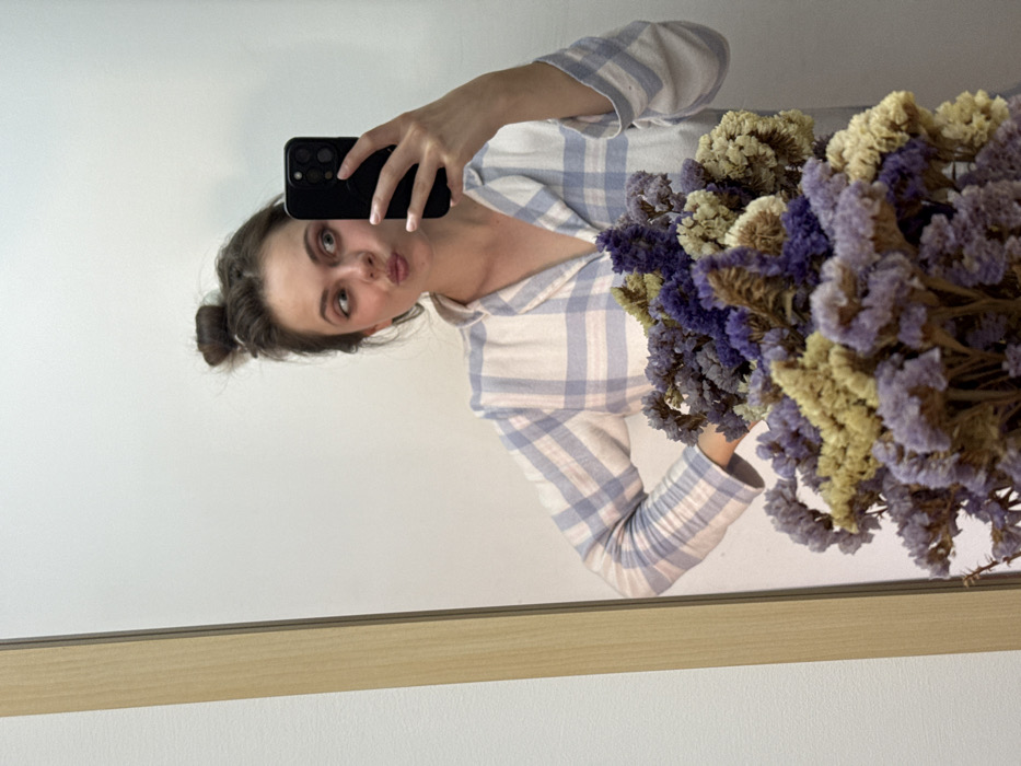 This image presents a mirror selfie of a young adult female in an indoor setting in Fiuggi, Italy. The subject, with her hair gathered in a messy bun, is positioned centrally, wearing a light blue and white plaid pajama top. She has a puckered "kiss" expression on her face, with her eyes looking to the left. Her right hand holds a black smartphone, featuring multiple rear cameras, which is capturing the reflection. Her left hand rests on her hip. A large bouquet of dried flowers, predominantly purple/lavender and light yellow, is held in front of her, partially obscuring her lower torso. The background, visible in the mirror's reflection, consists of a plain white wall. A thin, light-colored wooden frame of the mirror is visible on the left edge of the image.