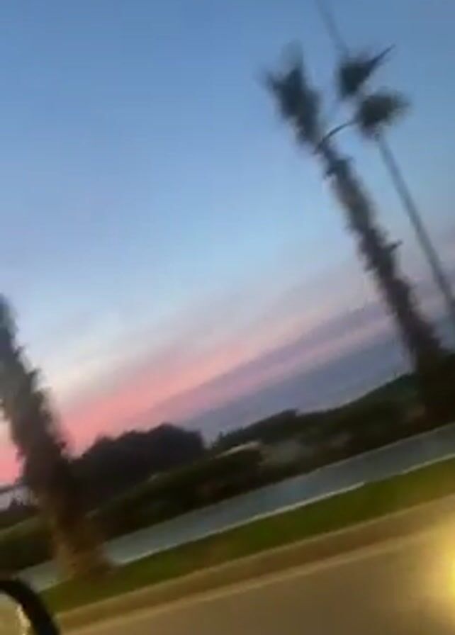 view from inside a car moving along a road lined with palm trees at dusk
