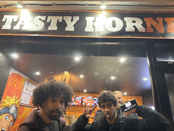 The image displays three males positioned in front of a commercial establishment identified by a black banner with white and orange lettering reading "TASTY HORN," located in Palaiseau, France