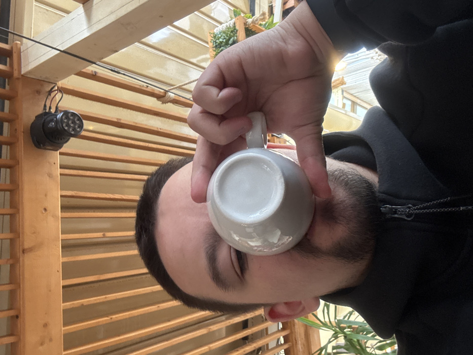 - "The image captures a close-up, low-angle perspective of an individual holding a white ceramic cup to their mouth, largely obscuring the lower face" by FM-k4myA2, licensed under CC BY 4.0