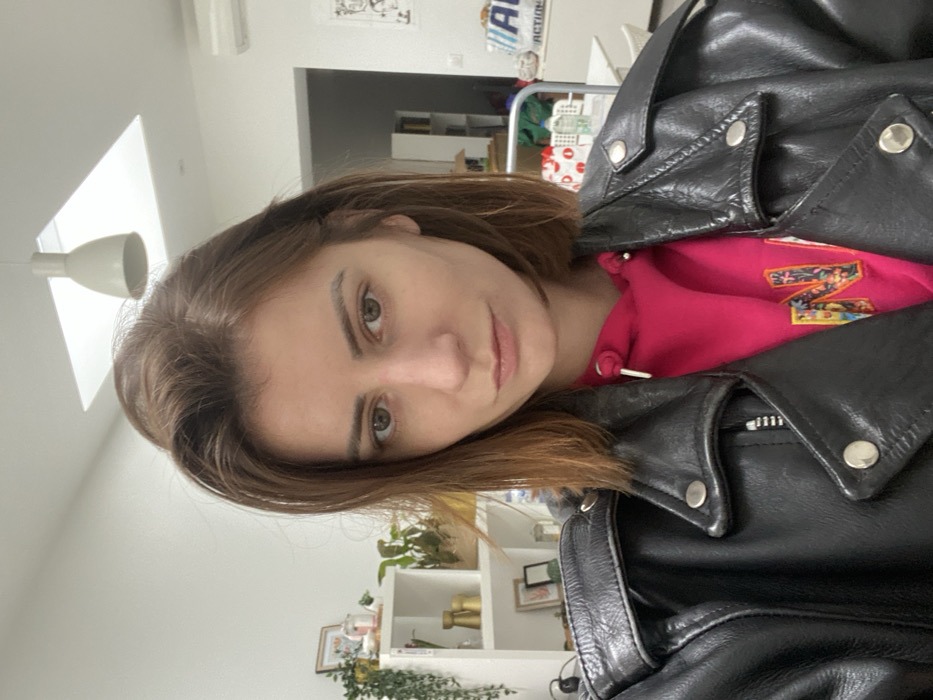 A female individual is depicted from the mid-torso upward, centered in an indoor setting identified as being in Lille, France. She has shoulder-length brown hair, light-colored eyes, and a neutral expression, looking directly at the viewer. She is wearing a black leather jacket with a notched lapel and silver snap buttons over a bright pink hooded sweatshirt with white drawstrings. A multi-colored, patterned design is visible on the front of the sweatshirt. The background features white walls and a white ceiling, which includes a rectangular skylight and a white pendant light fixture. To the left, a white shelving unit holds various items, including potted plants, small framed artwork, and gold-colored decorative objects. A black cable extends near her left shoulder. To the right, a white air conditioning unit is mounted high on the wall. A doorway opens to another room where a white bookshelf is partially visible. In the foreground on the right, a white table with white chairs is partially visible, holding a plastic water bottle, a white bag with red circular patterns, and a blue and white item displaying "ACTION" text.