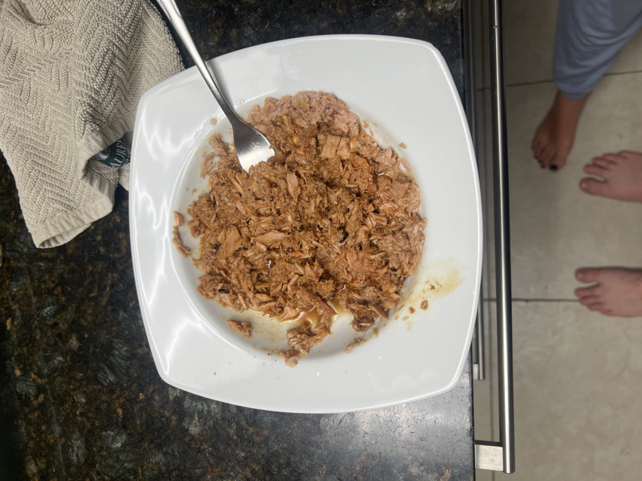 The image displays an overhead view of a domestic kitchen environment. In the center, a white, square-shaped plate holds a quantity of shredded, reddish-brown food, consistent with cooked fish or meat, partially mixed with a darker, viscous liquid or sauce. A silver-colored metal fork is inserted into the food on the right side of the plate. The plate rests on a dark, mottled countertop, which exhibits a speckled pattern typical of granite or similar stone. To the upper right of the plate, a beige-colored, textured cloth, possibly a kitchen towel with a chevron pattern, is visible, partially obscuring a tag that reads "LAUREN." Below the countertop, a light-colored tiled floor is present. On this floor, two bare human feet are visible; the left foot is fully exposed, while the right foot is partially obscured by light-colored pants and displays dark-painted toenails. There is no visual information within the image to confirm the specified location in Mexico City, Mexico.