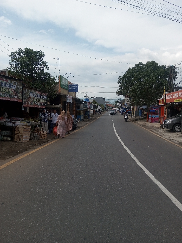 The scene depicts a street view in the city of Chhenangri_Rishor, Bhutan, under an overcast sky. A two-lane asphalt road, marked by a solid white center line, extends into the distance, with a yellow line delineating the left shoulder. Utility lines are visible overhead. On the left side of the road, a fruit stall operates with multiple individuals present. One banner displays "BUAHAN SEG..." and another reads "JUAL BELI BUAH GROSIR & ECERAN," indicating wholesale and retail fruit sales. Wooden crates are stacked on the ground near the stall. Two women, wearing patterned dresses and headscarves, walk away from the camera along the road's edge. One woman carries a red bag. Two men stand near the fruit stall; one in a white shirt, the other in a striped shirt. Further down, buildings line the street, including one with a blue sign reading "APOTEK" (pharmacy). On the right side of the road, a large tree with dense green foliage stands. An orange sign, partially visible, advertises "BAKSO & MIE AYAM." A dark-colored multi-purpose vehicle is parked parallel to the road. In the distance, other vehicles, including a motorcycle, are visible on the road, indicating traffic flow. Buildings extend along both sides of the road as it recedes into the background.