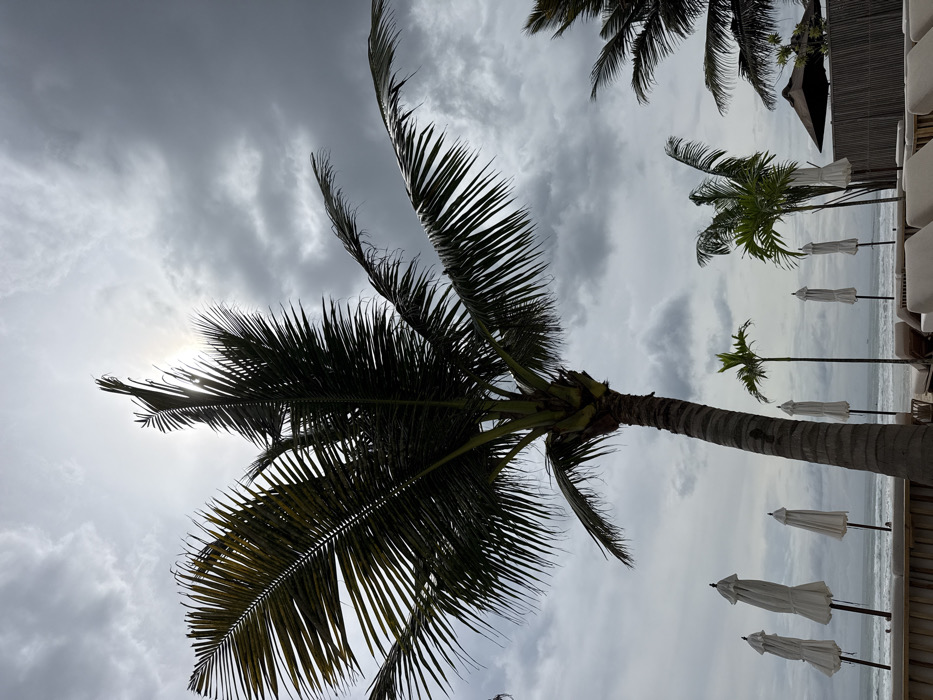 The image depicts an outdoor coastal scene in Kathaluwa, Sri Lanka, under heavily overcast skies. A prominent, tall palm tree with a thick trunk and dense fronds dominates the central foreground, silhouetted against a bright, obscured sun visible through the clouds in the upper center. To the left and right, additional palm trees of varying heights are present. The mid-ground features a leisure area bordering a body of water, likely the Indian Ocean. This area includes a row of approximately seven closed, white beach umbrellas positioned behind a low, light-colored wooden barrier or wall. Several light-toned lounge chairs or daybeds are arranged in the foreground and mid-ground. Beyond the barrier and umbrellas, white-capped waves are visible on the ocean surface, extending to a horizon line under the grey sky. In the far right background, a dark, thatched-roof structure is partially visible behind a dark wooden fence. No individuals are clearly discernible within the frame.