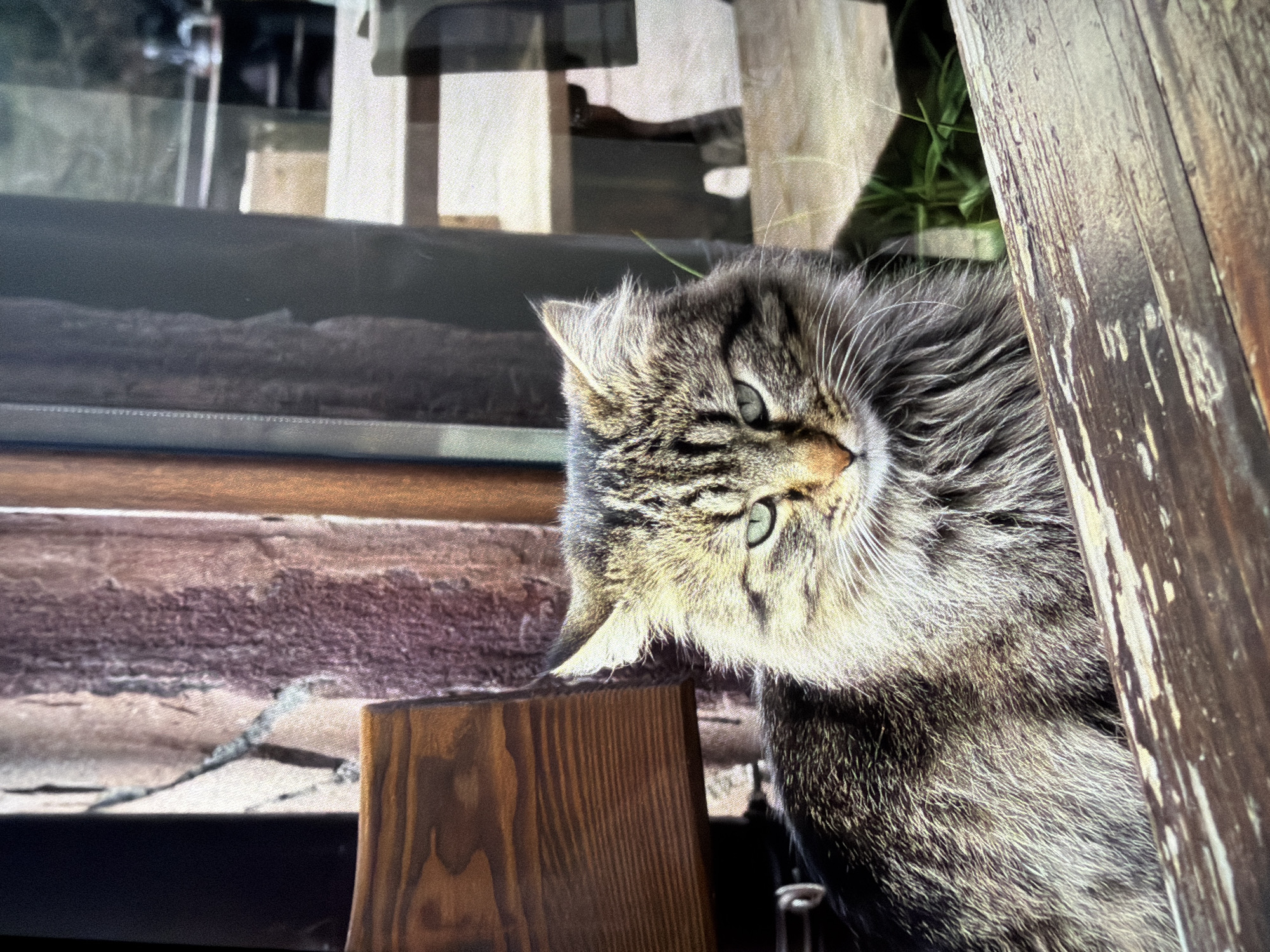 A long-haired domestic cat, exhibiting a brown and grey tabby fur pattern with prominent stripes, sits facing forward. The cat possesses green eyes, appearing partially closed, and a pink nose with white whiskers. It rests on a dark wooden surface, likely a bench or chair. In the foreground, a horizontally planked, worn wooden surface with chipped paint or finish occupies the bottom third of the image. To the cat's immediate left, a portion of a dark wooden chair back is visible. The background consists of a textured, reddish-brown wall with a vertical fissure on the left. To the right, a reflective glass panel or window reveals blurred reflections of interior or exterior tables and chairs, suggesting a dining establishment. A small patch of green vegetation is visible to the right of the cat, between it and the reflective surface. The scene occurs in an unspecified location within the city of Sofia, Bulgaria. No human subjects or overt actions are depicted.