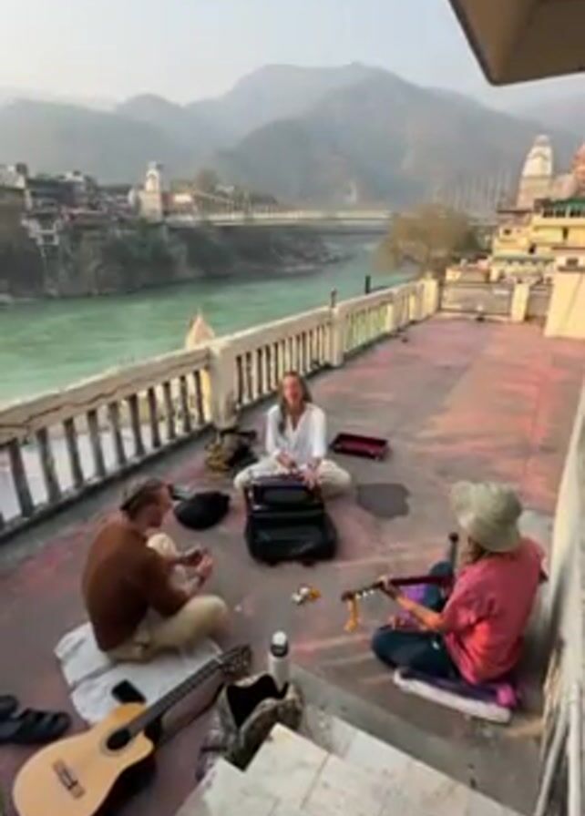 Three people are sitting on a rooftop by a river with mountains in the background. One woman, wearing white, sits cross-legged and plays a keyboard. A man in a brown shirt sits to her left, facing her, holding his hands. A second man, in a pink shirt and hat, sits to the right of the woman and plays an acoustic guitar. Two acoustic guitars are on the ground. The river is green and a bridge spans across it. Buildings are visible along the riverbank. The rooftop is painted with light shades of pink and purple.
