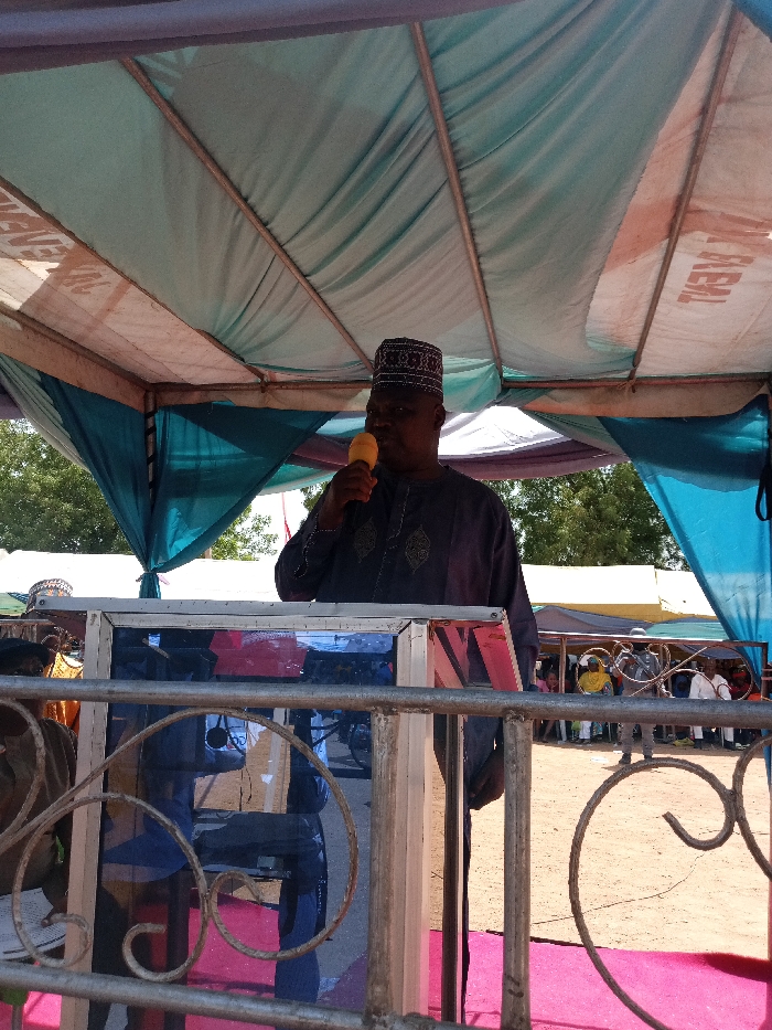 A man in a grey robe and a red and black hat is speaking into a microphone at a podium. The podium is located under a canopy tent with a blue top and a white bottom. The man is standing in front of a crowd of people gathered in a dusty area. The canopy is supported by metal poles, and there are trees in the background. The location is Zum, Nigeria, and the coordinates are 10.116, 13.046. The man is looking at the audience. He is holding the microphone in his right hand and his left hand is resting on the podium. A metal railing with a curly design is positioned in the foreground. The railing is painted black. The audience is sitting on chairs and standing in a casual manner. There is a red carpet on the ground in front of the podium. The man is speaking into the microphone and seems to be engaging with the audience.