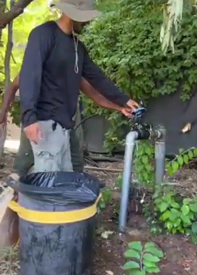 Two men are working on a water pipe in a garden or backyard setting. The man in the foreground is wearing a long-sleeved black shirt, light-colored pants, and a sun hat. He is adjusting a blue and black device attached to the pipe. Water is spraying out of the pipe, and a black trash can with a yellow rim is positioned nearby. The second man is partially visible behind him, wearing a white tank top. The area around the pipe is covered with dirt and small plants, and there are taller trees and greenery in the background.