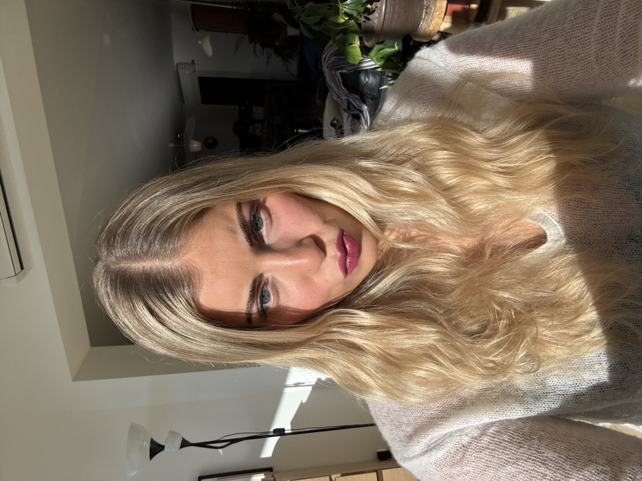 A close-up indoor portrait depicts a Caucasian female subject, located in the city of Rousset, France. She has long, wavy blonde hair with a central parting and blue eyes. Her lips are pursed, and she wears dark red lipstick. She is dressed in a light-colored, semi-sheer knit V-neck sweater. Direct, strong sunlight enters from the subject's right (viewer's left), illuminating her face and casting prominent highlights and shadows. The background on the left features a white wall, a black floor lamp with a white shade, and an air conditioning unit mounted high on the wall. The background on the right is darker, revealing glimpses of potted plants and indistinct furniture. The subject is looking directly towards the camera.