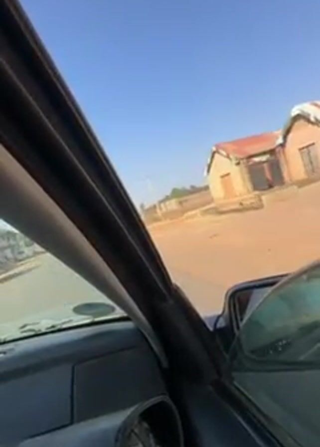 view from inside a car moving down a red dirt road. The sky is clear and blue. Buildings can be seen to the right of the road, and people and vehicles appear to be on a paved road to the left. Power lines run along the right side of the dirt road.