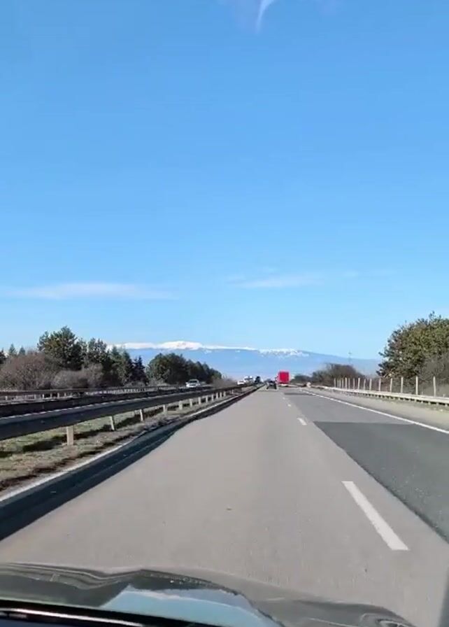 The camera is positioned from inside a vehicle traveling on a multi-lane highway on a sunny day. Cars, trucks, and other vehicles are visible driving in the same direction. A mountain range with snow-covered peaks is visible in the distance. Trees and vegetation line the side of the highway. The sky is clear and blue with minimal clouds.