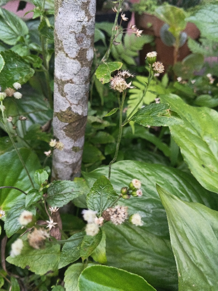 The image presents a close-up, static view of dense vegetation in Ciherang, Indonesia. A slender, vertically oriented tree trunk, approximately centered but slightly to the left, serves as a prominent feature. The trunk exhibits a light greyish-brown bark with irregular, darker brown and greenish-grey mottled patterns. Surrounding the trunk and filling the entire frame is an array of green plant life. Numerous small, herbaceous plants are visible, characterized by dark green, oval to lanceolate leaves with visible venation and slightly serrated edges. Interspersed among these leaves are multiple clusters of small, light-colored, fluffy flower heads or developing seed structures, predominantly appearing off-white to pale brown. Larger, broader green leaves with distinct veining occupy the foreground and background, particularly on the right side and bottom of the frame. No individuals, animals, or discernible actions are present within the scene, which is captured under natural lighting conditions.