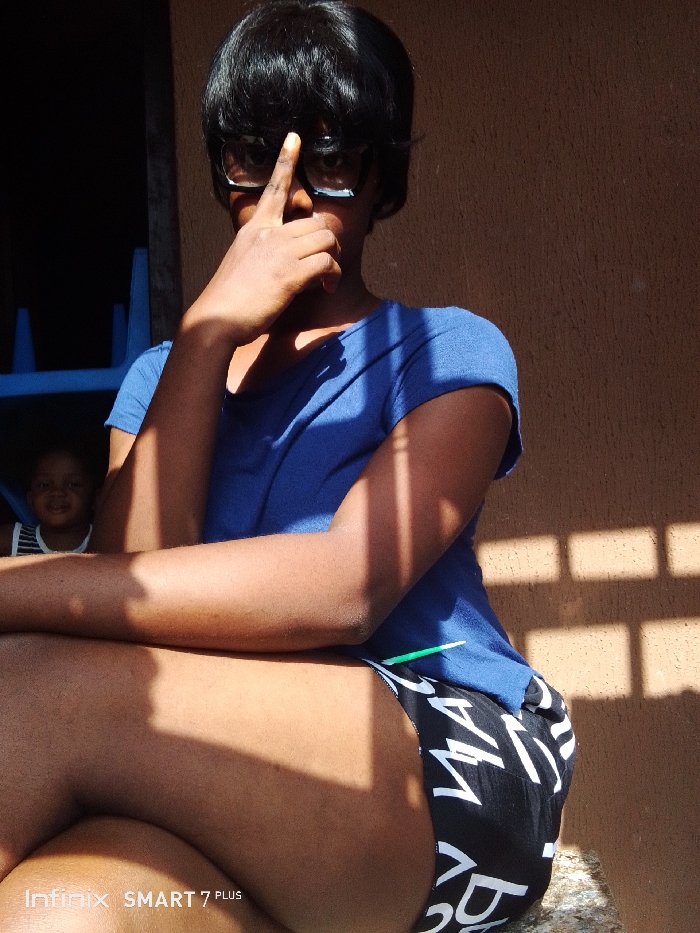 This image depicts a young adult female and a young child in an outdoor or semi-enclosed setting within the city of Unknown, Unknown. The primary subject, a female with dark skin and short black hair, is seated in the foreground, facing the camera. She wears a blue short-sleeved t-shirt and black shorts patterned with white alphanumeric characters; a green object is tucked into her waistband on the left side. Her face is partially obscured by large, dark-framed glasses and her right hand, with the index finger touching the bridge of the glasses. Her left arm is positioned across her body, and her legs are angled to the right. To the left of the main subject and in the background, a young child with dark skin, wearing a white and dark striped sleeveless top, is visible, looking towards the camera with a faint smile. The background features a plain, textured wall of a reddish-brown color. Strong direct sunlight creates pronounced shadows, including a grid-like pattern on the wall to the right and linear shadows across the main subject's arms and legs. Stacked blue objects, possibly plastic chairs, are visible in the shadowy far-left background. The main subject is seated on a light-colored, textured surface. A watermark "Infinix SMART 7 PLUS" is present in the bottom left of the image.