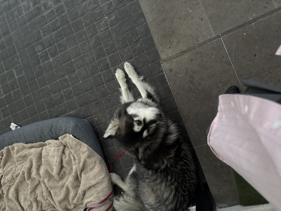 A husky dog lies on a dark, tiled floor, its white paws pointing upwards. The dog has a black and white coat and is looking directly at the camera. To the left, a dog bed with a beige blanket sits on the floor. Partially visible on the right is a person's leg wearing a dark shoe and a pink shirt. The composition of the image is an overhead shot, capturing the scene from a high angle.