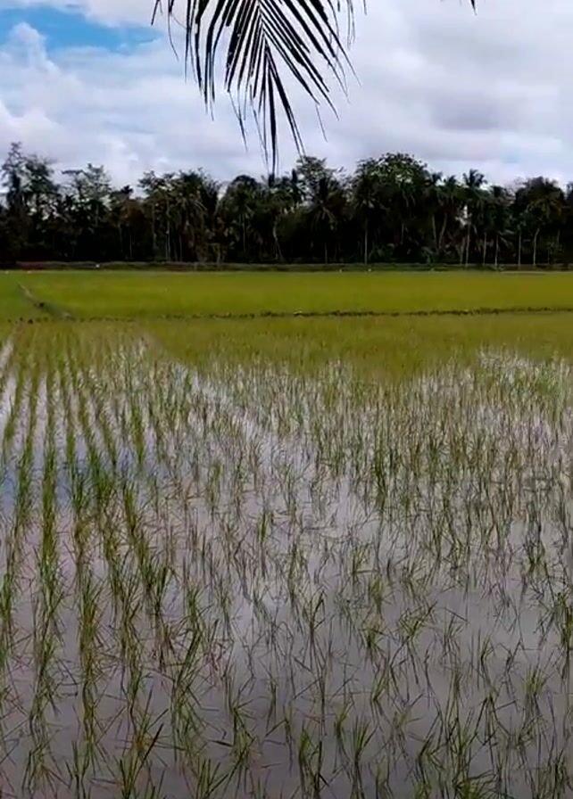 flooded rice paddy. Young rice plants grow in rows across the flooded field, their reflections visible in the water. In the background is a line of trees, and the sky above is blue with scattered white clouds. Palm fronds are visible in the upper corners of the frame. The camera is still.
