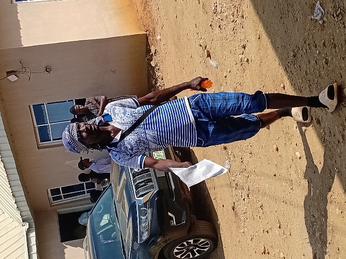 An individual wearing a blue-and-white patterned shirt, matching headwear, and blue plaid shorts stands in front of a dark-colored car. They hold a white paper in one hand and a small orange bottle in the other. The background includes a light-colored building with windows and a dirt ground with sparse vegetation. Other people are visible behind the individual, suggesting a small gathering.