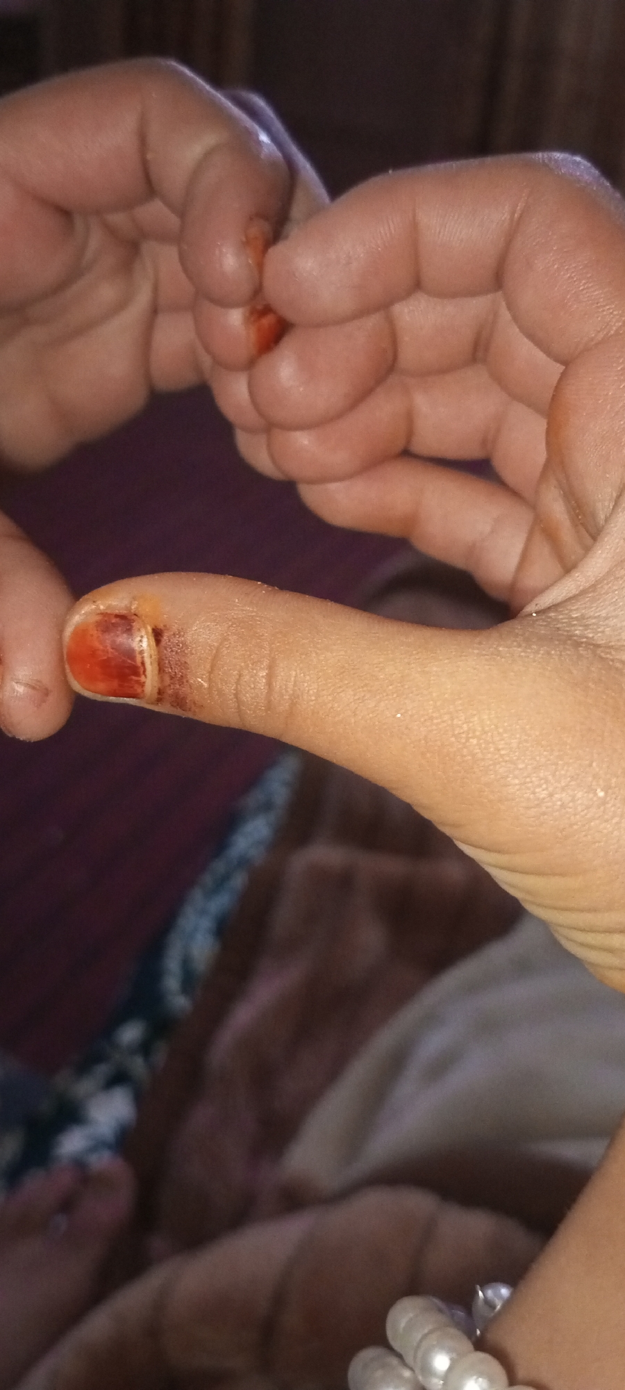 Within an indoor setting in Mansehra, Pakistan, two human hands are depicted in close proximity. An upper left hand, with a medium skin tone, is shown with its thumb and index finger grasping a small, reddish-orange, paste-like substance. A lower right hand, also exhibiting a medium skin tone, presents an extended thumb. The nail plate of this thumb is coated with the same reddish-orange substance, consistent with a fresh application of henna or a similar dye, which also extends onto the surrounding skin and cuticle area. A multi-strand pearl bracelet is visible on the wrist of the lower right hand. The background is blurred, showing soft fabric textures in dark purple and brown tones.