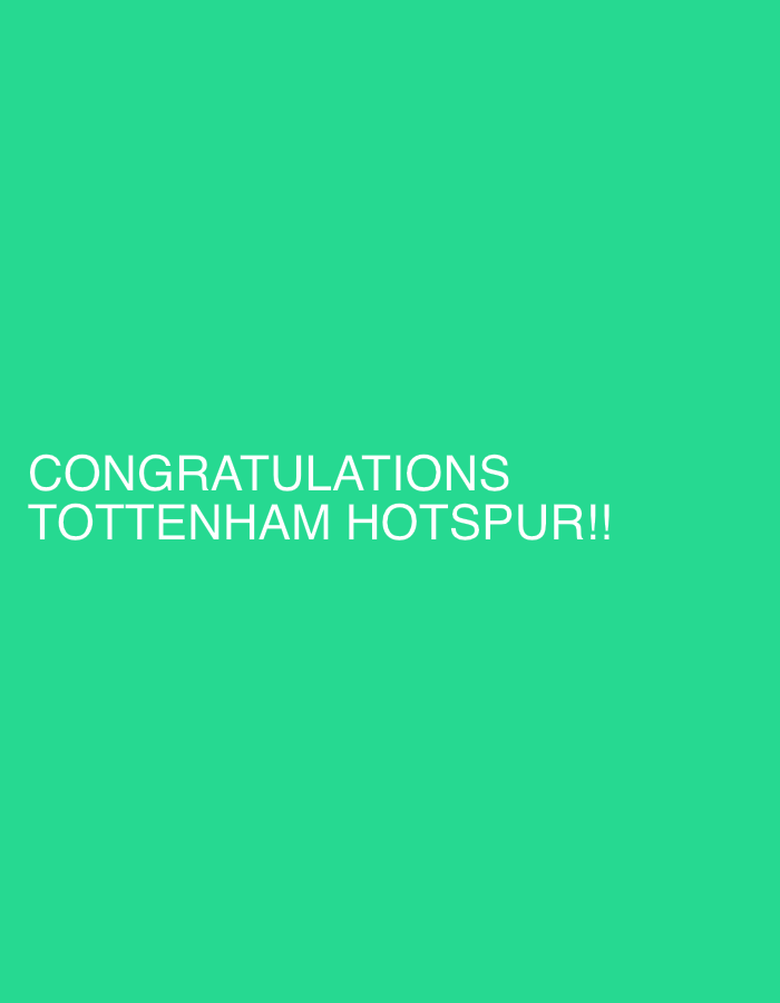 solid green background with the text "CONGRATULATIONS TOTTENHAM HOTSPUR!!" in white