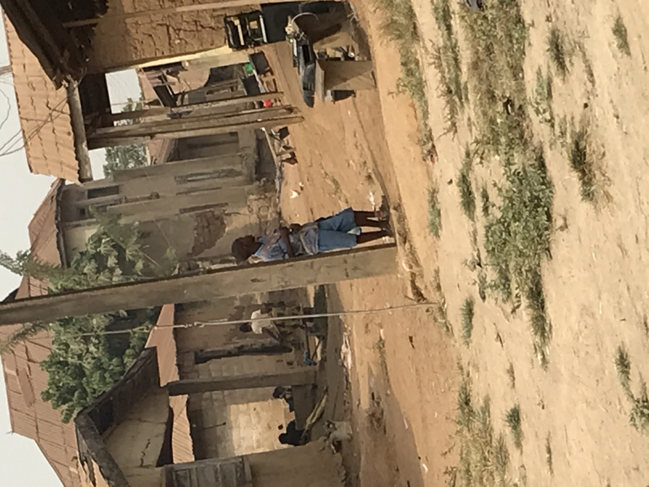 This image depicts a daytime street scene in Ago-Abo, Nigeria. A juvenile male, dressed in a light-colored short-sleeved shirt and blue shorts, stands leaning against a prominent utility pole in the right foreground, gazing towards the right, out of frame. The ground is unpaved, composed of reddish-brown dirt and sand, with scattered patches of sparse green vegetation. In the midground, several chickens forage on the dusty path. To the left, a male individual in a white t-shirt is actively engaged near a manual water pump-like structure adjacent to a single-story building. Further to the left, two other figures are seated or reclined on the ground near an entrance to another building. The street is lined with residential structures, predominantly single-story, constructed with mud or concrete block walls and topped with corrugated metal roofs, many appearing weathered. A taller, multi-story building with a distinctive curved facade and a corrugated metal roof is visible in the background. In the right midground, a black electronic device, resembling a printer or VCR, rests on a makeshift stand. Miscellaneous debris is visible throughout the scene.