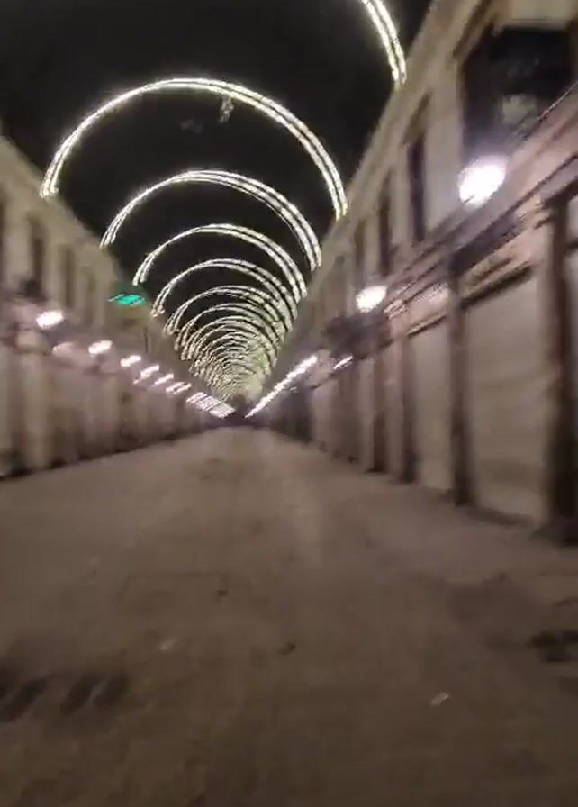 young man walking down an empty street or tunnel at night. The street is lined with buildings that have closed shutters, and is illuminated by string lights hung in arches above the street. The person is wearing a dark jacket and looks at the camera as they walk. Other people are barely visible in the distance. The ground is paved.