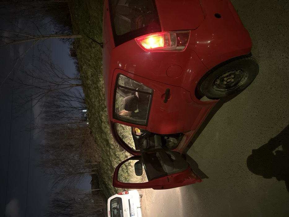 The image depicts an outdoor scene at night, located on an unidentifiable roadside area within Sofia, Bulgaria, despite a visible license plate on a background vehicle indicating the Gabrovo region. In the foreground, a red compact hatchback car is parked on the right side of a paved asphalt surface. The front driver's side door of the red car is wide open, exposing the dark gray interior, including the steering wheel, dashboard, and the driver's seat. A person with light brown or blonde hair is partially visible occupying the front passenger seat. The car's left rear brake light is illuminated. The vehicle is equipped with black steel wheels and a rear roof-mounted antenna. A photographer's shadow, holding a handheld device, is cast onto the pavement in the lower left foreground. Further back and slightly to the left of the red car, a white van or utility vehicle is parked on a dirt shoulder. Its rear is visible, displaying a Bulgarian license plate with the registration "EB 8218." The background features a rising grassy embankment covered with numerous bare deciduous trees, suggesting a late autumn or winter setting. Faint, distant artificial lights are visible on the horizon, indicating the presence of a populated area beyond the trees. The sky above is dark with visible cloud cover. The scene is illuminated by artificial light sources, possibly streetlights or vehicle lights, casting defined shadows.