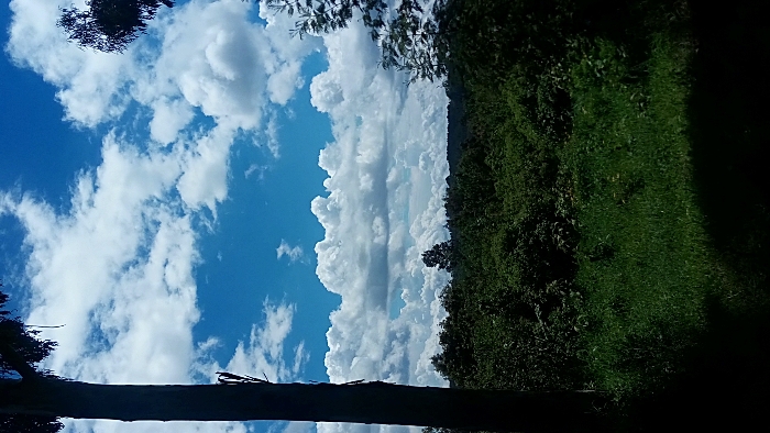 The image displays a verdant, open landscape in Ndeiya, Kenya, under a prominent bright blue sky filled with numerous white cumulus clouds. The upper half of the frame is dominated by these clouds, some appearing larger and more developed, with hints of darker cloud formations in the far distance. The foreground consists of dark green grass and various low-lying plants, with a significant portion of the bottom area in deep shadow. The midground features a dense, expansive canopy of dark green trees and bushes, forming an irregular, unbroken forest line that extends towards the background. A singular, taller tree stands out centrally in the mid-distance, silhouetted against the sky. A thick, dark tree trunk runs vertically along the entire left edge of the frame, with minimal foliage visible at its top. On the right side, the upper branches and leaves of another tree with lighter green foliage partially intrude into the frame. No human figures, animals, or man-made structures are visible within the scene.
