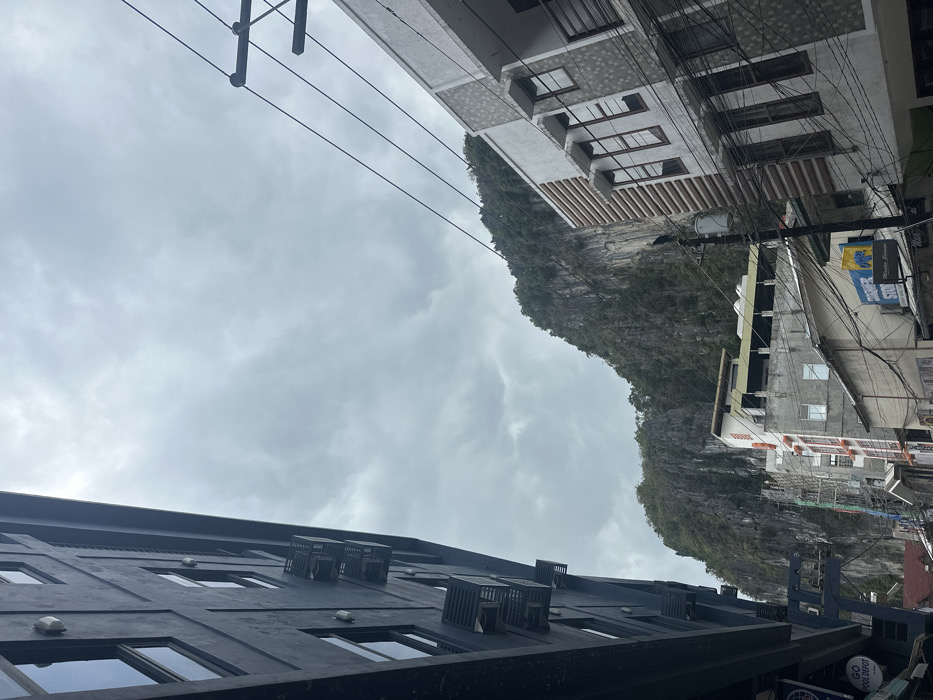An upward-angled view showcases buildings flanking a cloudy sky, with a natural rock formation visible in the distance. On one side, a modern dark-colored building stands out with rows of windows and air conditioning units. The opposite side presents taller, lighter-colored buildings intertwined with a multitude of power lines, hinting at a bustling urban environment nestled within the natural landscape.
