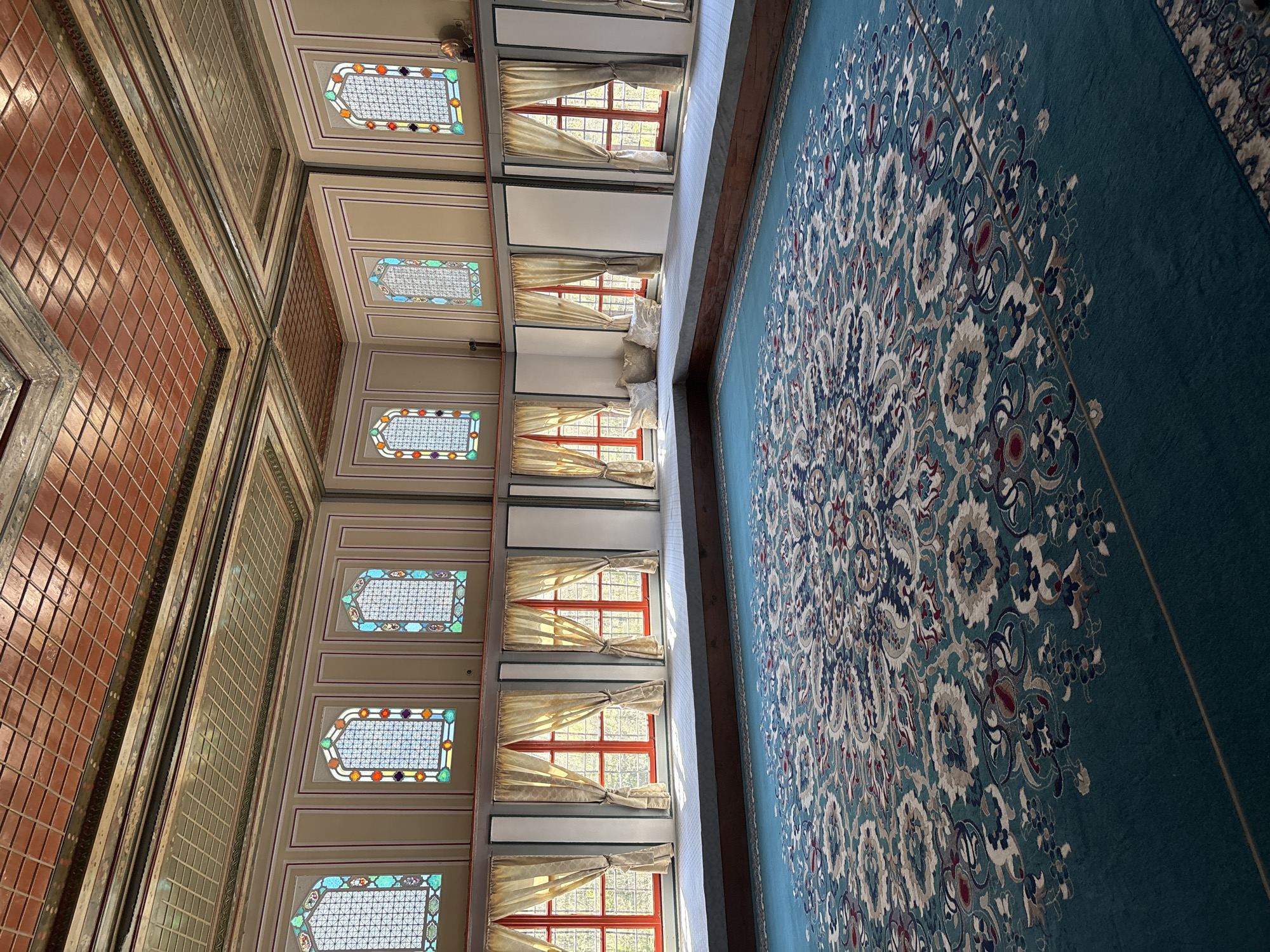 The image depicts an interior view of the Kordopulov House in Melnik, Bulgaria. The angle of the shot is looking upwards, showing the ornately decorated ceilings and walls. The ceiling is divided into sections with patterned tiles and intricate wooden detailing. The walls feature rows of windows with sheer curtains, allowing natural light to filter into the room. A large carpet with a complex floral design dominates the right side of the image, indicating a focus on opulence and design within the historical home.
