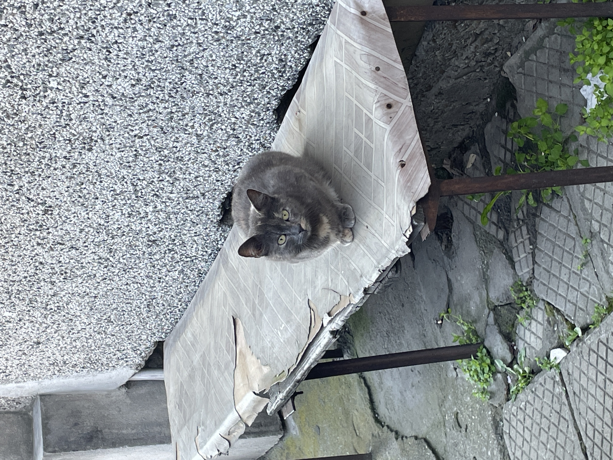 - "gray cat sitting on a partially damaged piece of material with a faux wood grain pattern" by FM-03WT23, licensed under CC BY 4.0