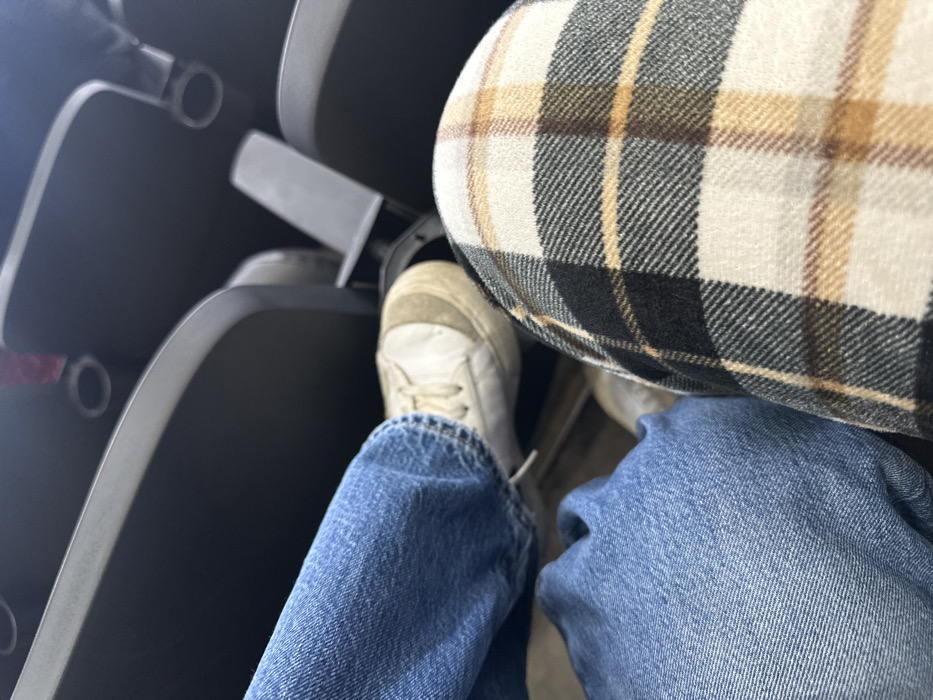 A top-down shot focuses on a person seated on a plane. The passenger wears blue jeans and off-white sneakers. Their leg is pressed against the seat in front, which is upholstered in a beige, brown, and black plaid fabric. The armrest and the back of the seat in front are visible in the background, both in dark gray. The photo is taken in a well-lit setting.