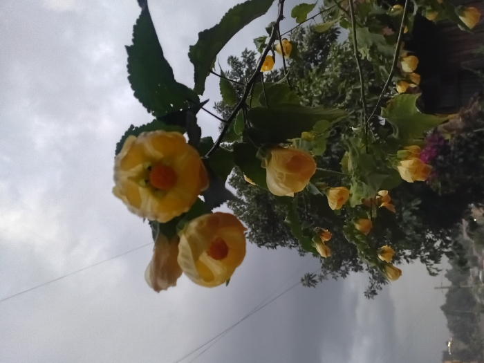 A cluster of yellow flowers with orange centers hangs downwards from a branch with jagged-edged green leaves. More blooms and foliage fill the background, blurring into a darker, denser green mass. The sky above is overcast with grey clouds, creating a muted light. A power line diagonally crosses the scene.