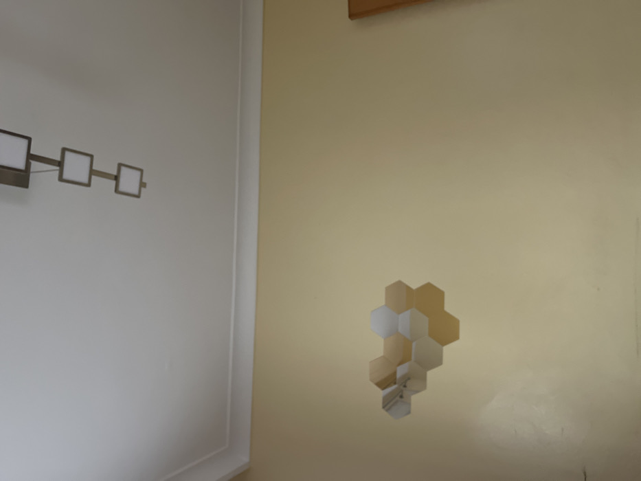 The image displays the interior of a room located in Salé, Morocco. The upper section of a light yellow-beige wall is visible, terminating at a white ceiling adorned with a white crown molding. A modern ceiling-mounted light fixture, constructed from metallic elements, is positioned in the upper right quadrant, featuring a rectangular base and three vertically suspended square light units. On the mid-left portion of the yellow wall, an assembly of eleven hexagonal decorative tiles is affixed, alternating between white/silver and light brown/gold tones. A narrow, vertical wooden structure is partially visible along the extreme right edge of the frame. No individuals, actions, or interactions are present.