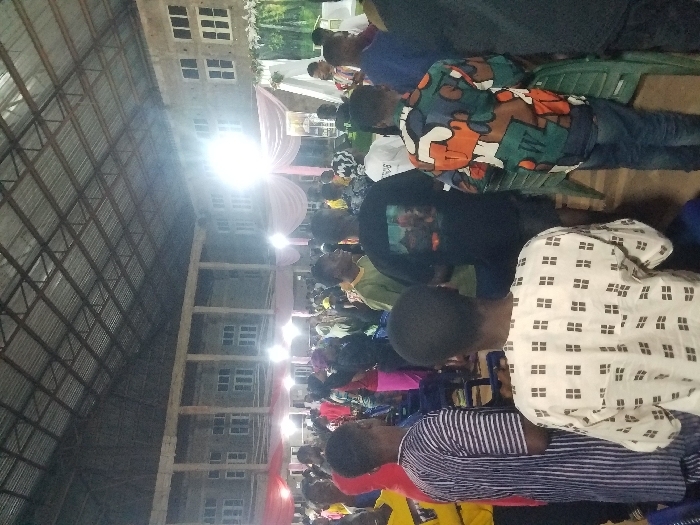 The image depicts a large indoor gathering of approximately 30-50 individuals, predominantly young adults, within a spacious hall in the city of Unknown, Unknown