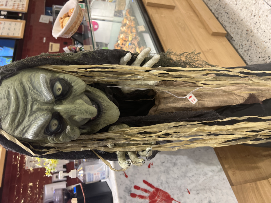 A life-sized Halloween witch decoration, featuring a green, wrinkled face with a hooked nose, exposed yellowed teeth, and bright yellow eyes with white pupils, occupies the central foreground