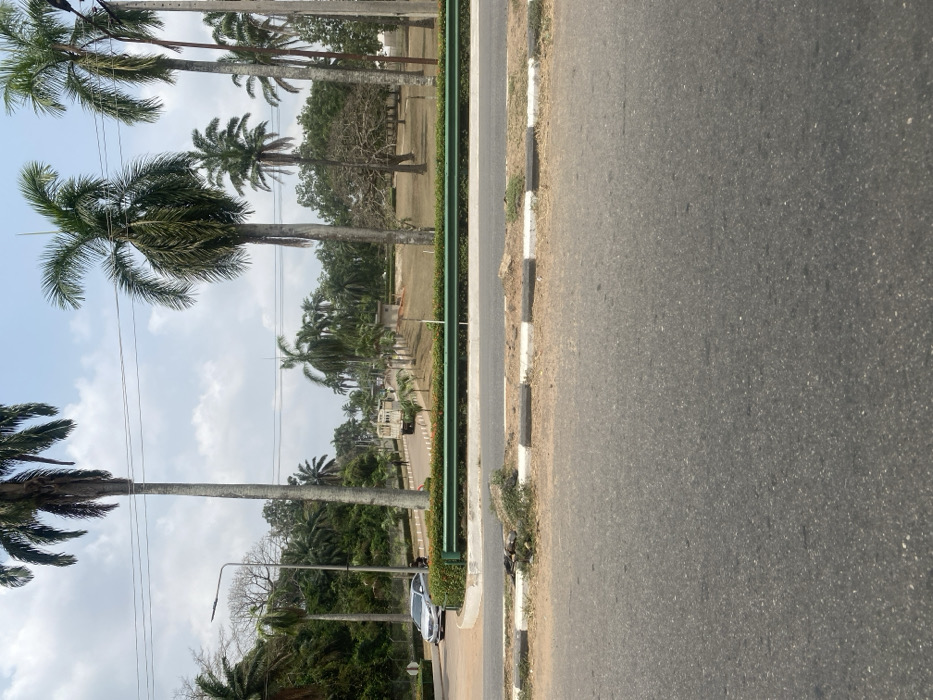 The image presents an exterior scene in Odo Ona, Nigeria, featuring a paved road alongside a landscaped area dominated by palm trees under a partly cloudy sky